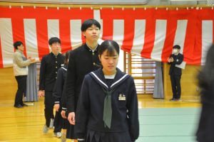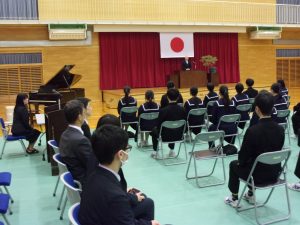 明日の卒業式に先立って、卒業記念品贈呈式と同窓会入会式を行いました。