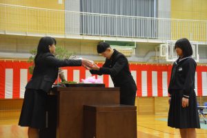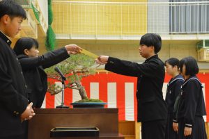 3年生の代表生徒が、校長先生から卒業証書の筒と印鑑を受け取りました。