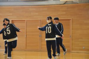 本日の4時間目に、1学年の保健体育でダンスの発表を行いました。今日まで、グループごとに隊形を相談したり、振り付けが揃っているか確認し合ったりして、ダンスを磨いてきました。グループによって独創的な工夫があり、生徒たちも生き生きと表現活動に取り組んでいました。