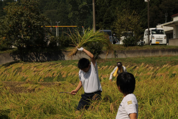 前日の雨の影響で足下がぬかるむ中、朝から多くの地域の方々にお世話していただき、稲刈り体験をしました。