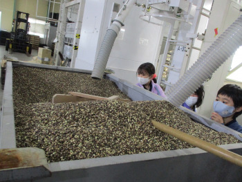 今日の校外学習は、ハトムギの乾燥・焙煎工場の見学です。