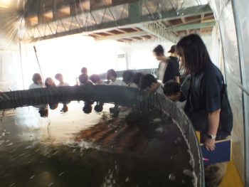 そして、同じ水槽にいるトラフグ同士がケンカをして傷つけ合わないように、トラフグの「歯切り」をしているところを見せていただきました。また、餌やりもさせていただき、みんな興味津々でした。