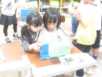 教室に戻り、捕まえた虫をタブレットを使って写真や動画に撮り、記録しました。