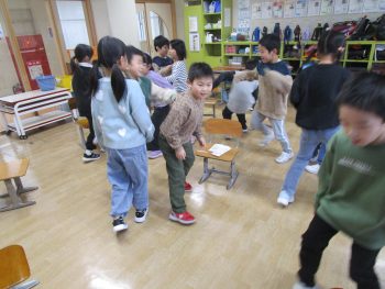 「冬休みにお手伝いを頑張った人」「おもちを食べた人」「はつもうでに行った人」など、自分に当てはまるお題が出ると、「わあ~」と椅子の取り合いをして、楽しく体を動かして遊びました。