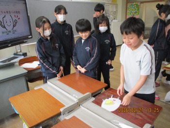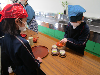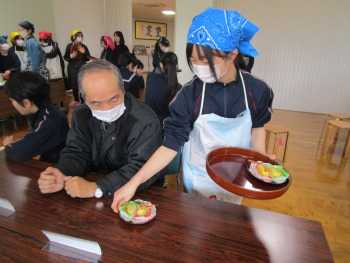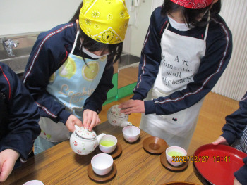 5年生が、家庭科の時間の学習を生かし、緑茶を入れ、スイートポテトとともに、お招きした方に届けました。
