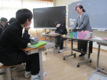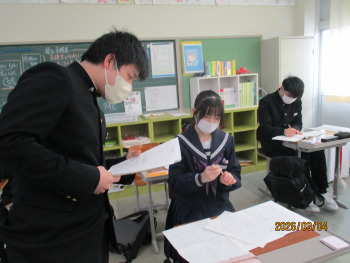 国語と理科、社会では、入試に向けたプリント練習を行い、教科係から教科担当の先生へ感謝の言葉を伝えました。