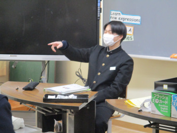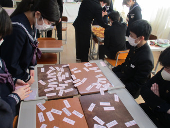 1時間目の英語では、明日の県立入試に向けて心構え聞きました。また、英語カルタで構文の最終確認をしました。