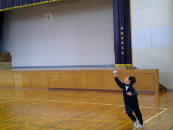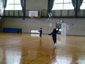 室内で風はありませんでしたが、みんなが走ると凧もビューン!と飛ぶようになりました。