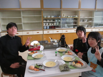 家庭科では、調理実習で「鮭のムニエル」と「コーンポタージュ」をつくりました。