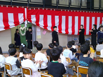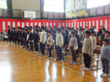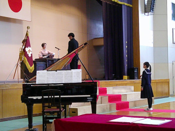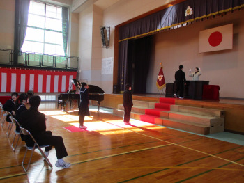 答辞に続いて、9年生は別れの歌として合唱曲「時を越えて」を歌い、全校合唱では1~9年生で「すてきな思い出」を歌いました。