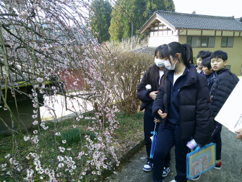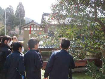 熊無地区には、ツバキが多く咲いています。今日は、そのツバキやサクラ等、熊無地区指定の自然文化財を地域の方のお話を聞きながらたくさん見て回りました。