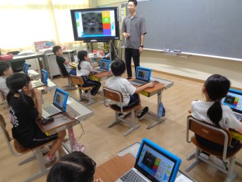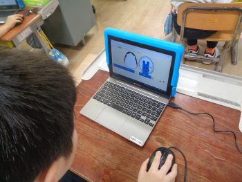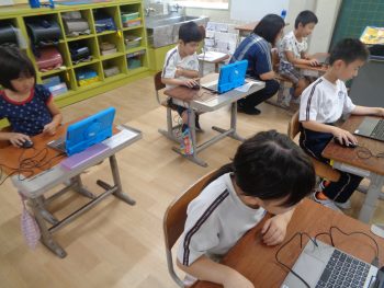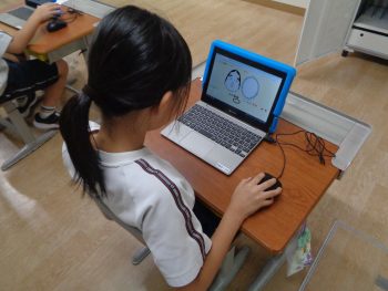 今回はマウスを初めて使い、「もぐらたたき」「福笑い」のゲームをしながら、クリック、ドラッグの練習をしました。