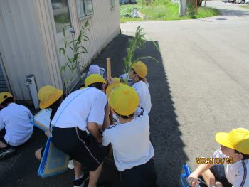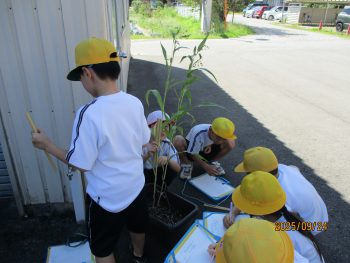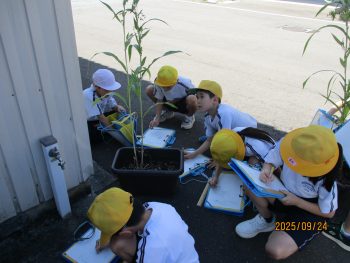 総合的な学習の時間で育てているハトムギを観察しました。30cmものさしを使い、高さをはかると115cm以上ありました。また実もつき始めていて、「これからどうなるのかな」と今後の成長も楽しみにしている子供たちでした。