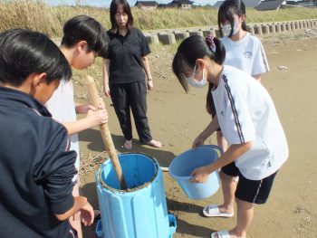 まず、大きいバケツの中に、砂と海水を入れて棒で押し固めます。