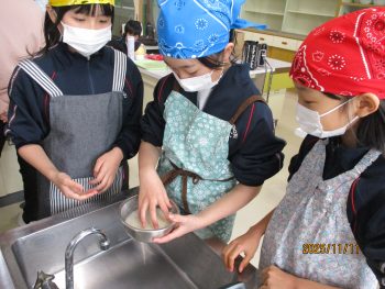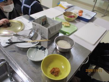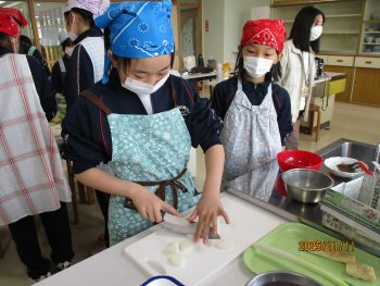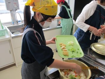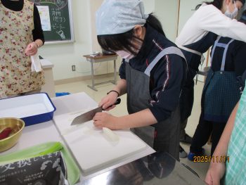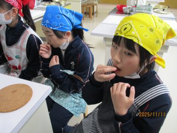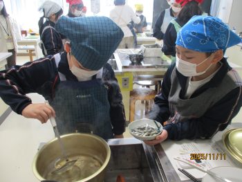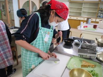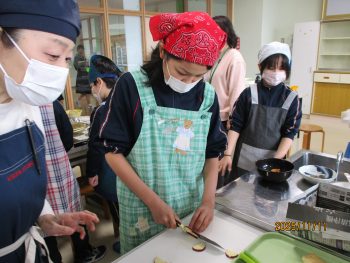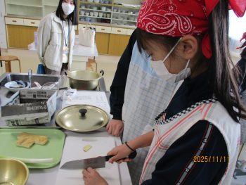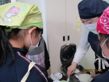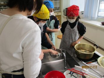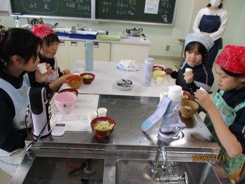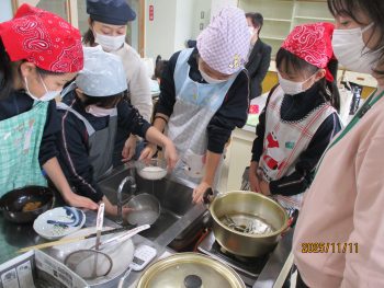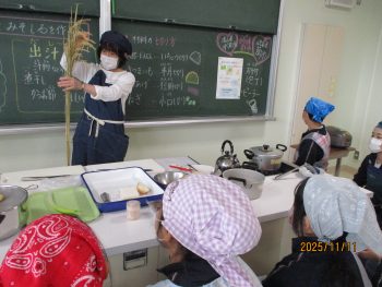 本日、家庭科の学習で、講師としてカムカムスマイルさんをお招きし、「みそしるの作り方」と「ごはんの炊き方」を教えていただきました。