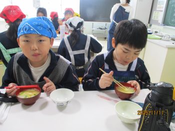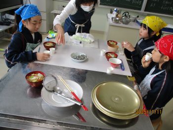食べる前に、お出汁があるお味噌汁とお出汁のないお味噌汁を比べます。