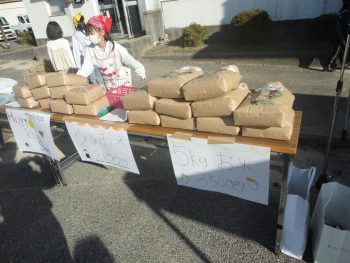 開店前から整理券を求めて大勢の方が列を作り、約30分で米、ポン菓子、わらを完売しました。