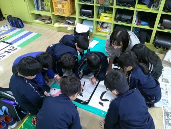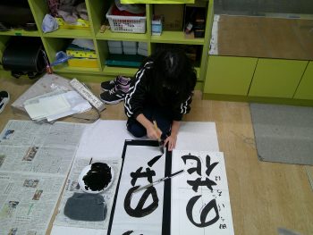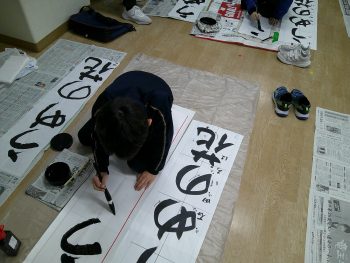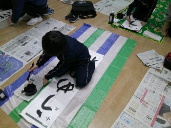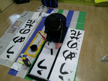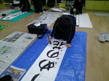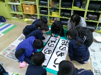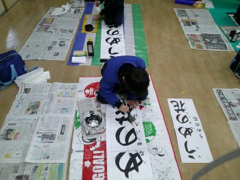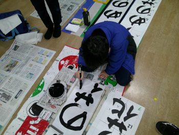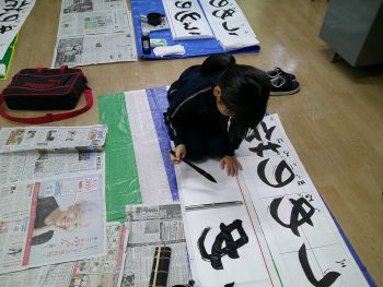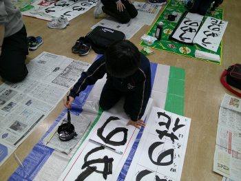 いよいよ筆に墨を付けて書き始めます。みんなに見守られながらゆっくり、ていねいに書いていました。見ていた子供たちは、「ここから書き始めるといいよ」「上手」と声をかけていました。