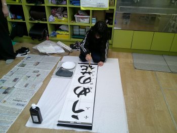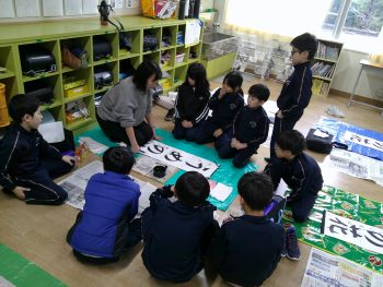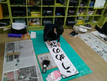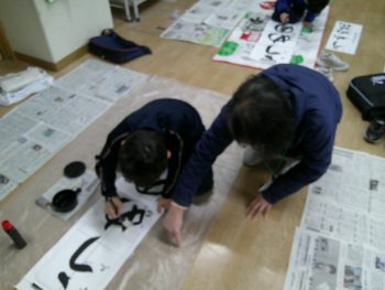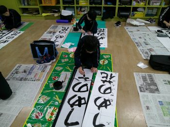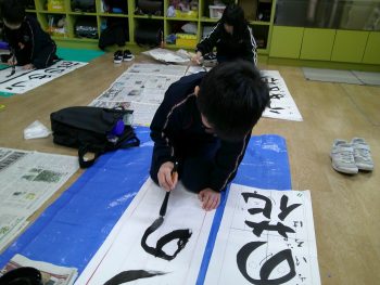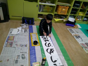 初めての書初に挑戦しました。最初に持ち物を確認し、書き方や書く姿勢を確かめました。習字で使う筆よりも大きい筆に驚きながら、お手本をなぞり書きしました。
