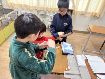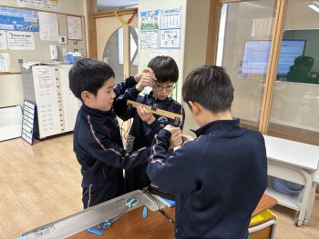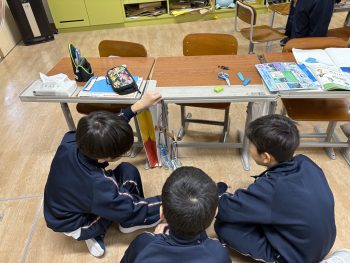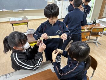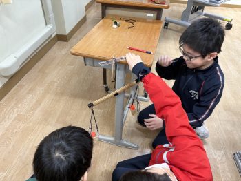 算数科「重さをはかって表そう」の学習では、道具を使って文房具の重さを比べました。道具作りからグループで協力して活動しました。「マジックと鉛筆はどっちが大きいのかな」「どっちのはさみが重いか比べよう」「同じ重さにしてみよう」といろいろなものの重さを比べ、ものさしやコップが下になっているものの方が重いということに気付きました。
