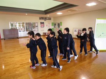 遠くまで走るこつを教えてあげる2年生。1年生は大喜びです。