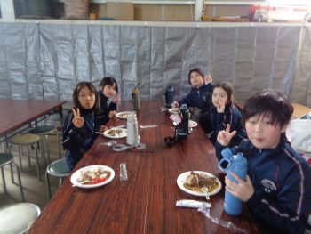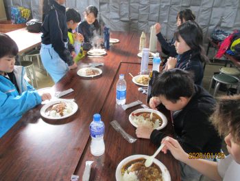 お昼はみんなでカレーを食べました。午前のスキー学習でお腹がペコペコになり、おかわりをしている人もいました。