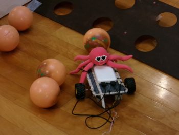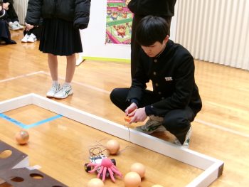 大会のテーマは「たこ焼きクエスト」です。所定の時間内に床に散らばった「たこ焼き」に見立てた球を所定の穴にいくつ入れることができるかを競います。