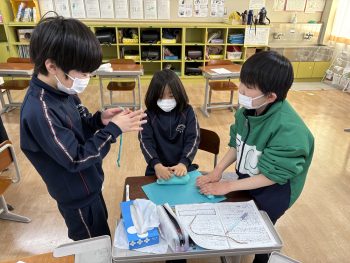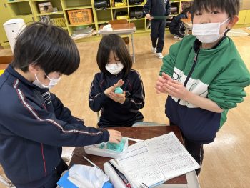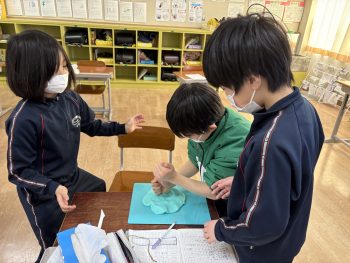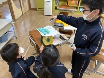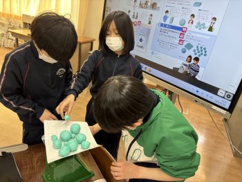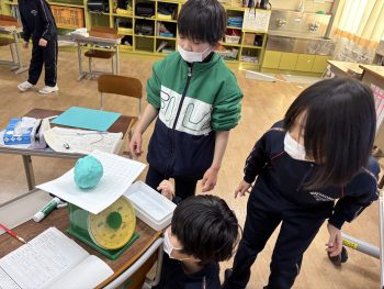 理科「ものの重さを調べよう」の学習では、粘土の置き方や形をかえたり、細かく分けたりすると重さは変わるのかを調べました。