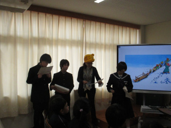 7年生は、「Grand Baba’s Warming Ideas!」(絵本「ばばばあちゃんのそりあそび」)を1,2年生に英語で読み聞かせをしました。