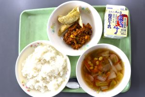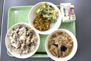 「未来の食材」とは、世界自然保護基金が発表した、地球にやさしく、安く手に入り、栄養価の高い食材のことです。今回の給食では、50種類の「未来の食材」の中から「キヌア・ごま・シコクビエ・ほうれん草・れんこん・チンゲン菜・えのき・わかめ・大豆」の9種類を使っています。