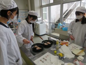 感染症対策を踏まえ、少ない人数で調理できるようペアを組んで調理し、試食は教室で行いました。