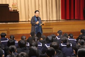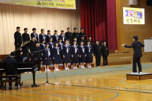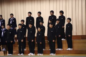 閉祭式では全校で「空も飛べるはず」を合唱しました。最後に3年生から後輩たちにエールを贈りました。2年生の新生徒会長は「これからの生徒会活動は僕たちに任せてください」と挨拶しました。